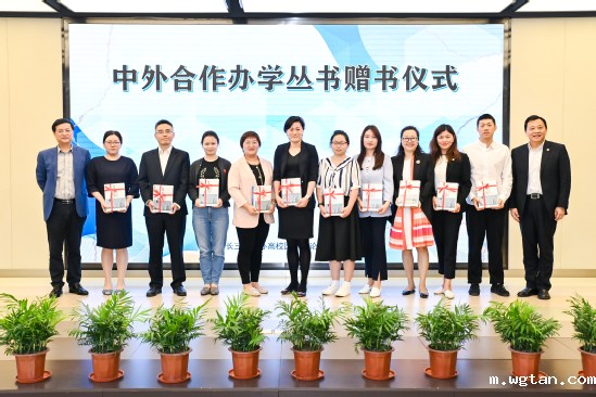 论坛中,上海市教育评估协会跨境教育专业委员会主任、上海工程技术大学副校长史健勇与上海市教育评估院教育综合事务评估所所长汪建华共同为与会学校代表赠送中外合作办学系列丛书。