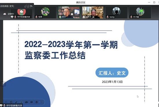 校监史文代表监察委总结了监察委本学期在学校常态化疫情防控、人事制度改革、16条学生能力素质培养标准的落实、学生部门“三抓三坚持”的实施、资产与采购管理制度的执行等方面所发挥的作用。回顾了在慎重如始,助力常态化疫情防控工作;凝聚共识,积极参与人事管理制度改革;协力同心,为完成独立学院转设任务添枝加叶;紧盯程序步骤,确保决策制度体系运行规范;守护办学理念,增强贯彻落实的行动自觉;聚焦重点,着力提高监督实效等方面的成绩,反思了理论学习不够系统完整、研判问题不够全面严谨、实地调研不够深入细致等方面的问题,表达了要坚持以改革的办法、创新的理念、务实的作风解决发展中的实际问题,与学校党委、行政、监事会一起,为实现学校“一、三、五”发展战略与策略目标和董事会工作纲要提出的全年目标任务而努力奋斗。