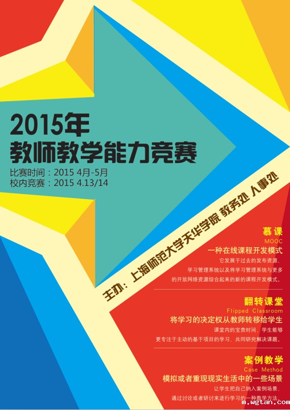 为鼓励我校教师进一步增强立德树人、教书育人的使命感,积极参与课堂教学改革,提升课堂教学技能,通过引入翻转课堂、案例教学等方法提高课堂教学效果,最终使更多的学生受益,根据本学期工作计划,结合“第二届上海市民办高校教学技能大赛”的校内选拔,2015年4月13至14日,学校组织开展了“2015年上海师范大学天华学院教师教学能力竞赛”暨“第二届上海市民办高校教师教学技能大赛”的校内选拔赛。全校教师踊跃报名,包括教育学院、语言文化学院等在内多个二级学院专门组织了赛前初选和团体、个别辅导,共有来自7个二级学院的27名教师参加了本次比赛。