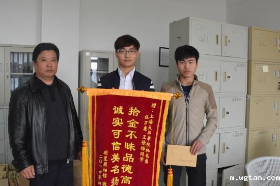 2016年4月11日,我校工学院收到市民朱明星送来“拾金不昧品德高、诚实可信美名扬”的锦旗,这面锦旗是感谢我校2015级机电1班伍万康、王张扬2位同学的拾金不昧,同时也对我校德育教育工作表示认可以及感谢。
