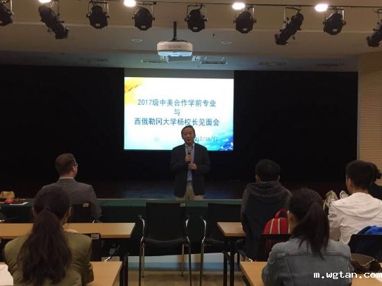 2017年10月17日,美国西俄勒冈大学分管国际交流的副校长Neng Yang应邀来访。教育学院17级中美合作学前专业与美国西俄勒冈大学校方代表在图书馆四楼多功能报告厅隆重举行见面会。国际交流处处长胡珍、教育学院副院长徐娟、中美学前专业主任杨艳、中美合作项目外教Terri、Tim等出席见面会。