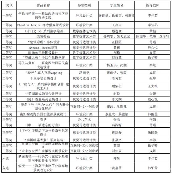 由中共上海市教育卫生工作委员会、上海市教育委员会主办的第三届“汇创青春”大学生作品征集展览活动在2018年4月下旬至6月中旬期间举行。本次活动共征集了上海及长三角地区四十多余所高校大学生在读期间完成的优秀文化创新创意作品三千余件,先后举办分类展览二十余场,参观市民学生数十万人次。我校艺术设计学院学生作品在本次为期两个月展览中脱颖而出,获得了一等奖六项,二等奖九项,三等奖七项,入围奖两项,获奖数创历史新高。具体名单如下: