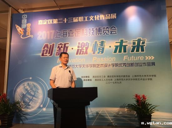 2017年9月18日下午, 2017上海嘉定科技博览会系列活动之一,“创新·激情·未来”我校艺术设计学院优秀创新创业作品展开幕式在嘉定区工人文化宫举行。嘉定区委副书记周金林,我校党委书记韩晓玉,区副巡视员陆晞,区科委主任陈蕴珠,区科委副主任金世珍,区总工会副处级干部龚英,我校艺术设计学院院长王大根,副院长朱花、徐子卿,以及师生代表等60多名人员出席本次活动。此次开幕式由区总工会党组书记、副主席金伟荣主持。