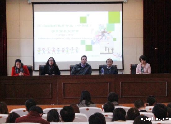 上海师范大学天华学院教育学院于3月16日10:45召开了2015级中美合作学前教育专业学生家长见面会。本次活动旨在对今年8月份即将前往美国西俄勒冈大学学习的同学及各位同学的家长进行答疑,莅临本次见面会的有西俄勒冈大学副校长杨能强、西俄勒冈大学教育学院院长Dr.Mark Girod、我校副校长龚春蕾、教育学院副院长徐娟、国际交流处处长胡珍、校党委书记助理凌琦、中美学前教育专业主任张丽、教育学院分团委书记及中美学前专业辅导员朱可。