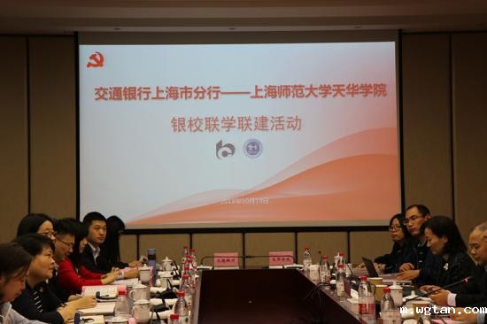 2018年10月19日星期五下午2点整,交通银行上海市分行大客户一部和审计部一行来到我校,与我校开展银校联学联建活动。大客户一部副总经理兼党总支副书记应陵姿、审计监督部副总经理王寒等交行相关员工与我校校长叶才福、党委副书记许岳、副校长朱国权等领导,来到同华楼会议中心一楼会议室召开联学联建交流会,朱国权副校长主持交流会。
