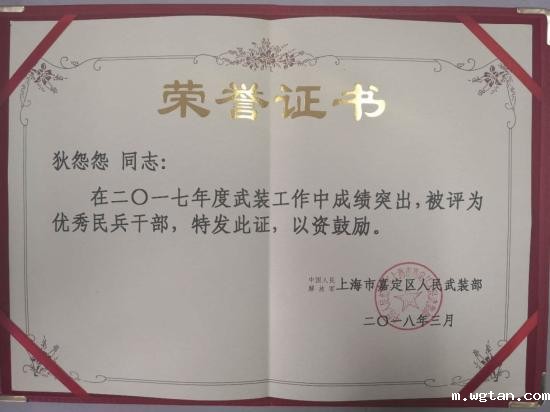 2017年,在上海警备区党委、嘉定区委、区政府、学校党委的正确领导下,学校武装工作深入贯彻落实上级指示精神,围绕提高履行使命能力,扎实推进国防后备力量建设,高标准完成了年度征兵工作,经上海市嘉定区人民武装部研究决定,授予我校武装部“先进基层武装部”荣誉称号,狄怨怨同志获得“优秀武装干事”荣誉称号。