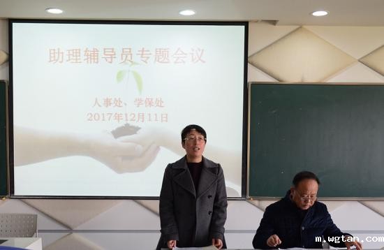 2017年12月11日,人事处、学保处在明华楼五楼演播中心召开助理辅导员专题会议,校党委副书记、学保处处长曹云林,校监、学保处副处长周烨刚,人事处常务副处长曹卫,学保处常务副处长刘天翔,团委书记包静波,各二级学院党总支书记,人事处处长助理李艳艳以及全校20名新教师出席会议。