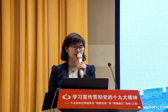 来自同济大学、上海外国语大学、上海理工大学、上海师范大学、上海商学院的五位上海市高校辅导员年度人物李睿、曹姝婧、章少哨、金黎琼、刘俊老师结合自己长期的工作和思考,从时代、使命、成就、坚守、梦想等五个主题,从不同角度,将十九大精神用鲜活的语言、生动的案例进行了深入浅出的讲解,用中国理念开启崭新征程、中国力量绘就宏伟蓝图、中国智慧展现大国担当、中国精神砥砺伟大梦想、中国青年书写人生华章。历时两个半小时的报告启迪智慧、催人奋进。